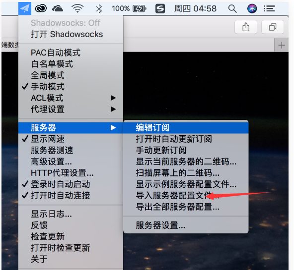 - 打开 Shadowsocks 应用程序,然后在顶部状态点击纸飞机图标,选择【导入服务器配置文件】